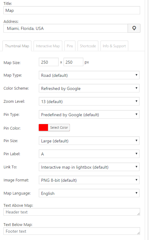 There are 6 options for thumbnail map links – disable link, open interactive map in lightbox, open custom URL in same or new tab, replace thumbnail map with interactive one, skip thumbnail map and imediately load interactive one.