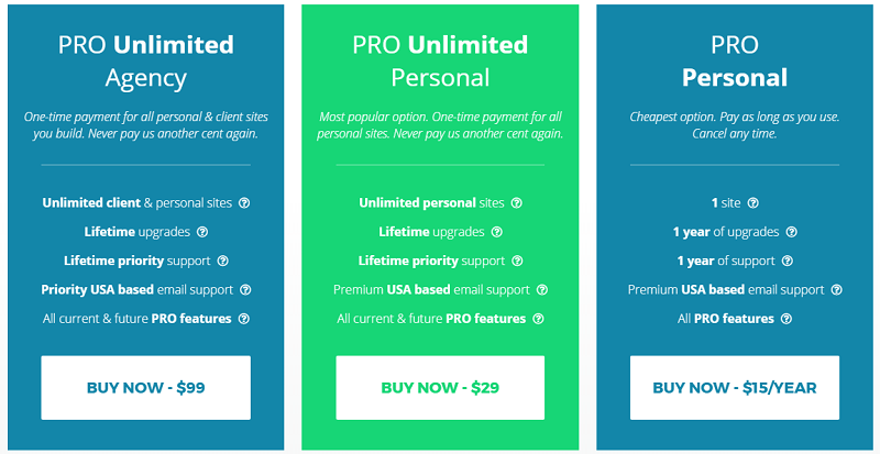 - PRO Unlimited Agency: at $99, for unlimited client and personal sites (lifetime upgrades);