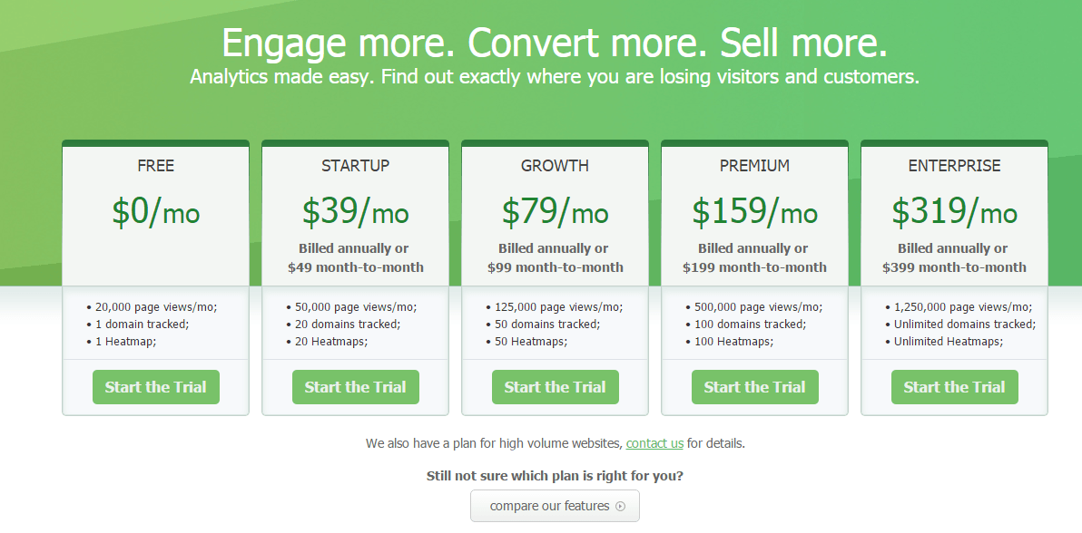 The best plan if the “Enterprise” ($319/mo), with unlimited domains tracked, unlimited heatmaps and up to 1,250,000 page views per month.