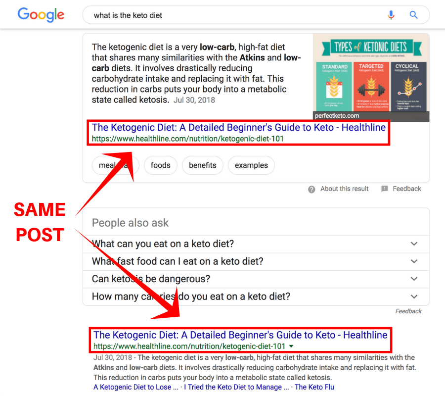 Being selected for search snippets gives your website double-representation — first in the snippet and again in the results. Wow!