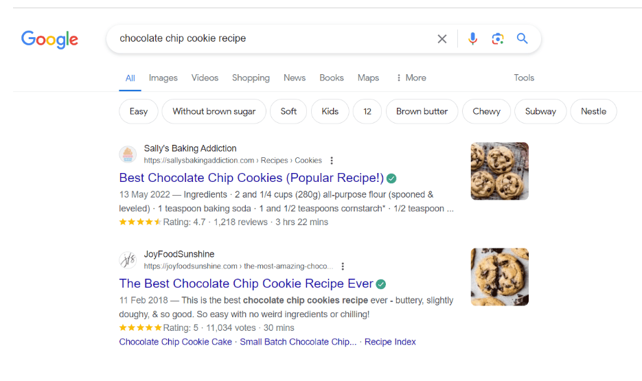 When you search for a recipe like “chocolate chip cookies recipe,” the search results often display not just the link to the recipe but also additional details like ratings, reviews, cooking time, and ingredients.