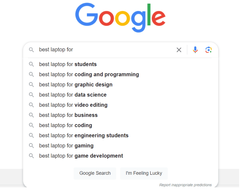 For instance, when you type “best laptop for,” autocomplete suggestions include: