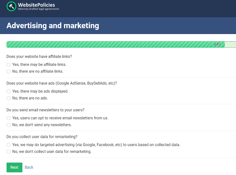 Select if your website has affiliate links or ads (like Google Adsense, BuySellAds, etc).