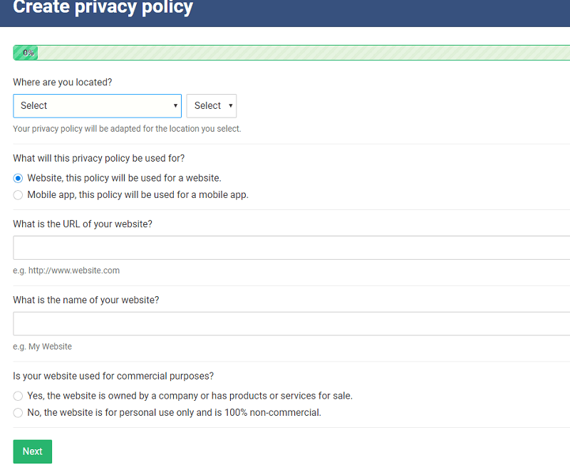 First, you want to choose your area (the privacy policy will be adapted for the location you select.)