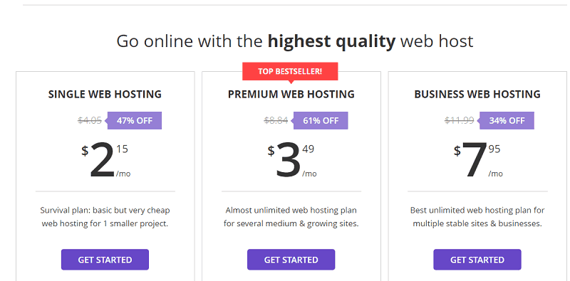 The “single web hosting” plan can be purchased with just $2,15/mo (go for it if you have just a small online project).