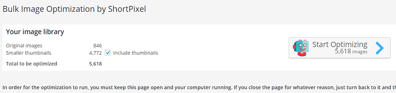 The process may take some time, depending on the number of images in your library. In the meantime, you can continue using your WP admin as usual, in a different browser window or tab (however, if you close this window, the bulk processing will pause until you open the media gallery or the ShortPixel bulk page again).