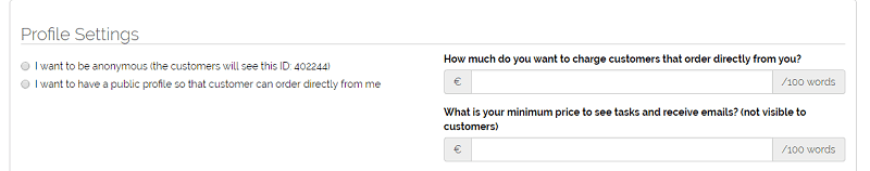 You want to set how much you want to charge customers for each order (price based on 100 words). Also, decide the minimum price to see tasks and receive emails (based on 100 words).