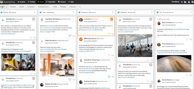 You can, for example, apply a mark on the mention rule, which then applies a lead score on the user who is mentioning your business on social media (SharpSpring is the first free CRM for small businesses providing marking automation rules to a social interaction).