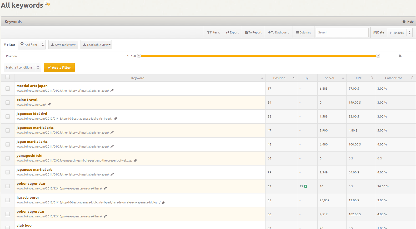 For example, when making a keywords overview, I discovered “martial arts japan” as an interesting long-tail keyword for my niche site. It’s already ranking really well, see: