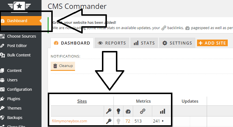 Let’s see in details some of the actions you can do in the CMS Commander dashboard (I made the test with one of my niche websites: FillMyMoneyBox.com).