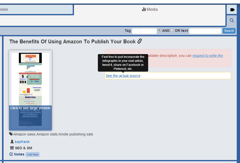 See a screenshot of user “kayfrank” offering an infographic about “The Benefits Of Using Amazon To Publish Your Book” :