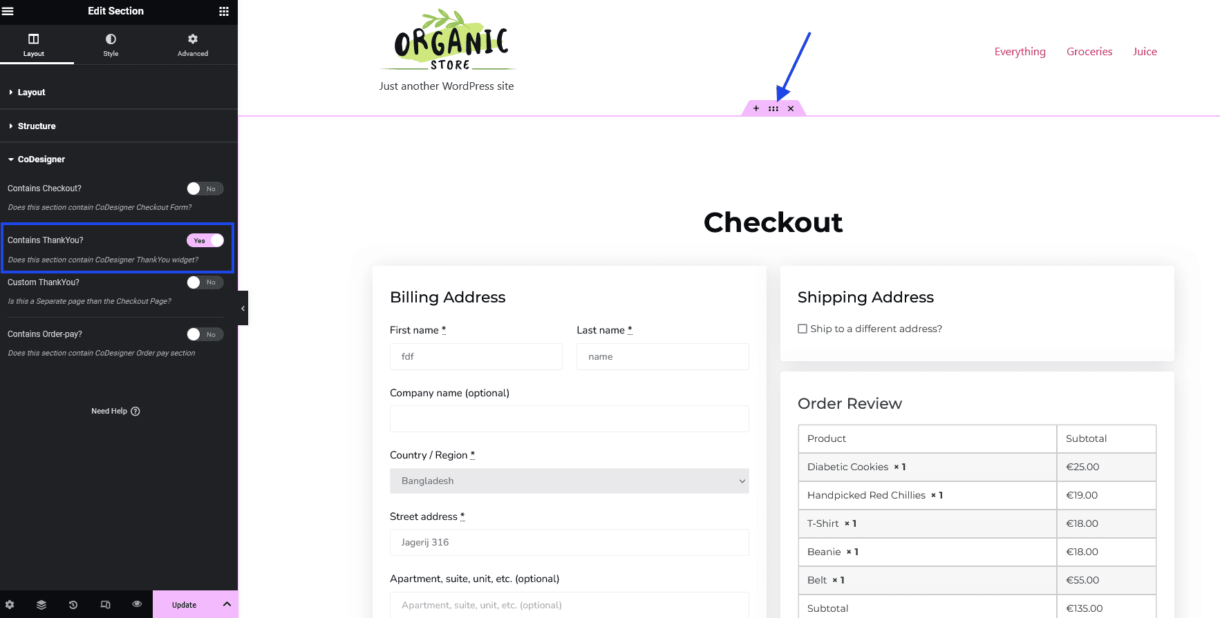 - When the customization is completed, click on the section and enable Contains ThankYou